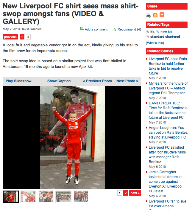 Using Adidas.com and LiverpoolFC.com, we launched the kit with a shirt swap, creating a viral as we gave eager fans their first look. A mobile video booth wrapped in the new shirt design filmed fans proudly telling the world why they made it Liverpool FC.