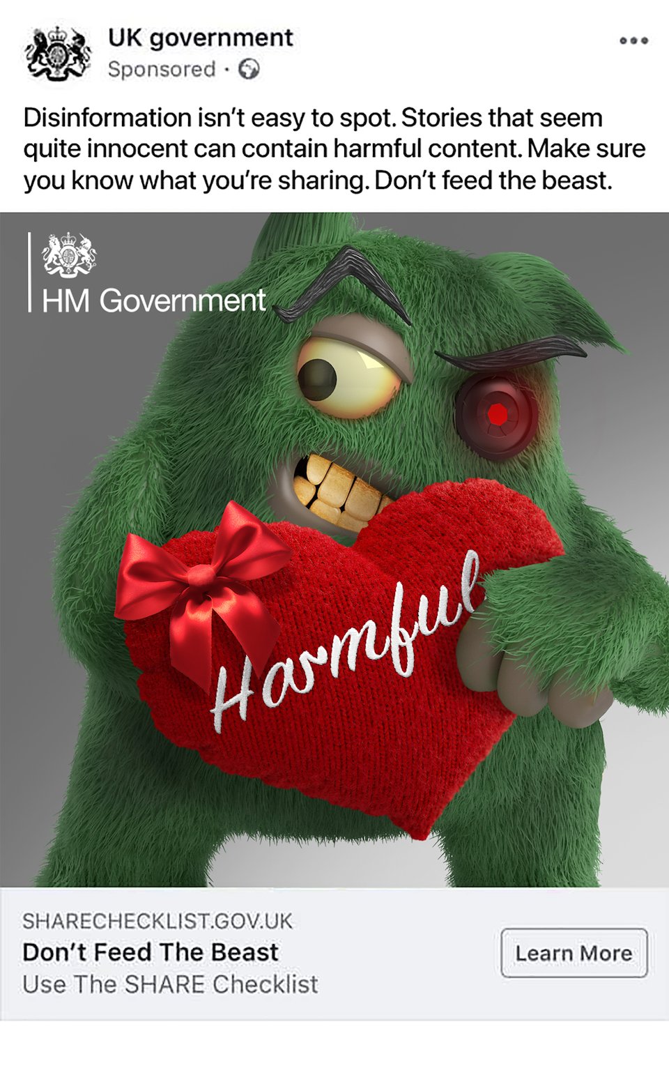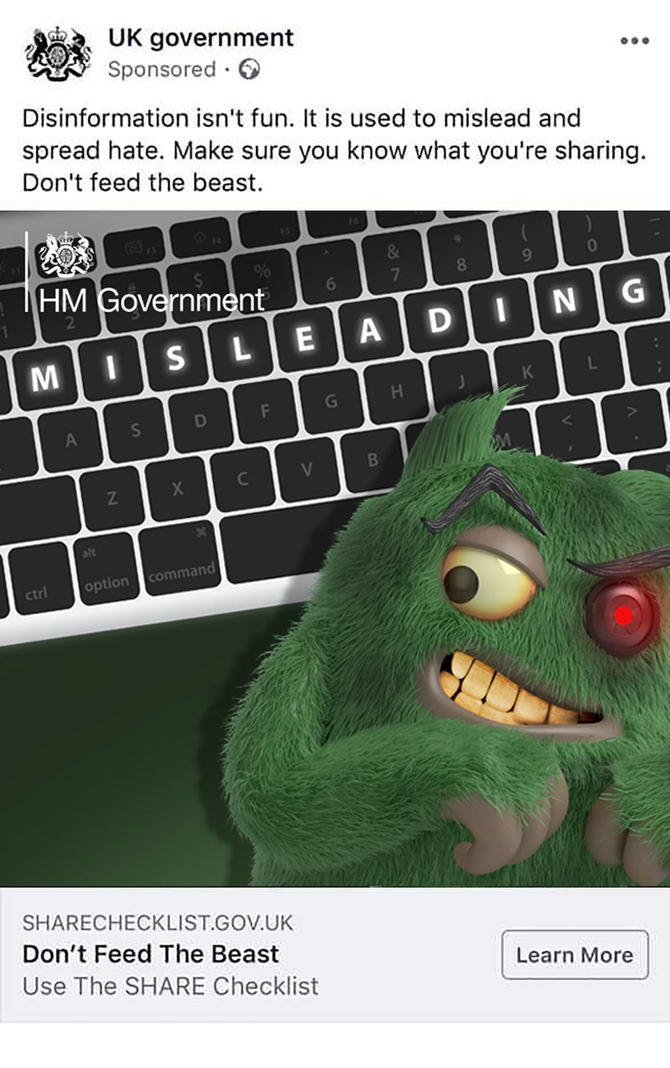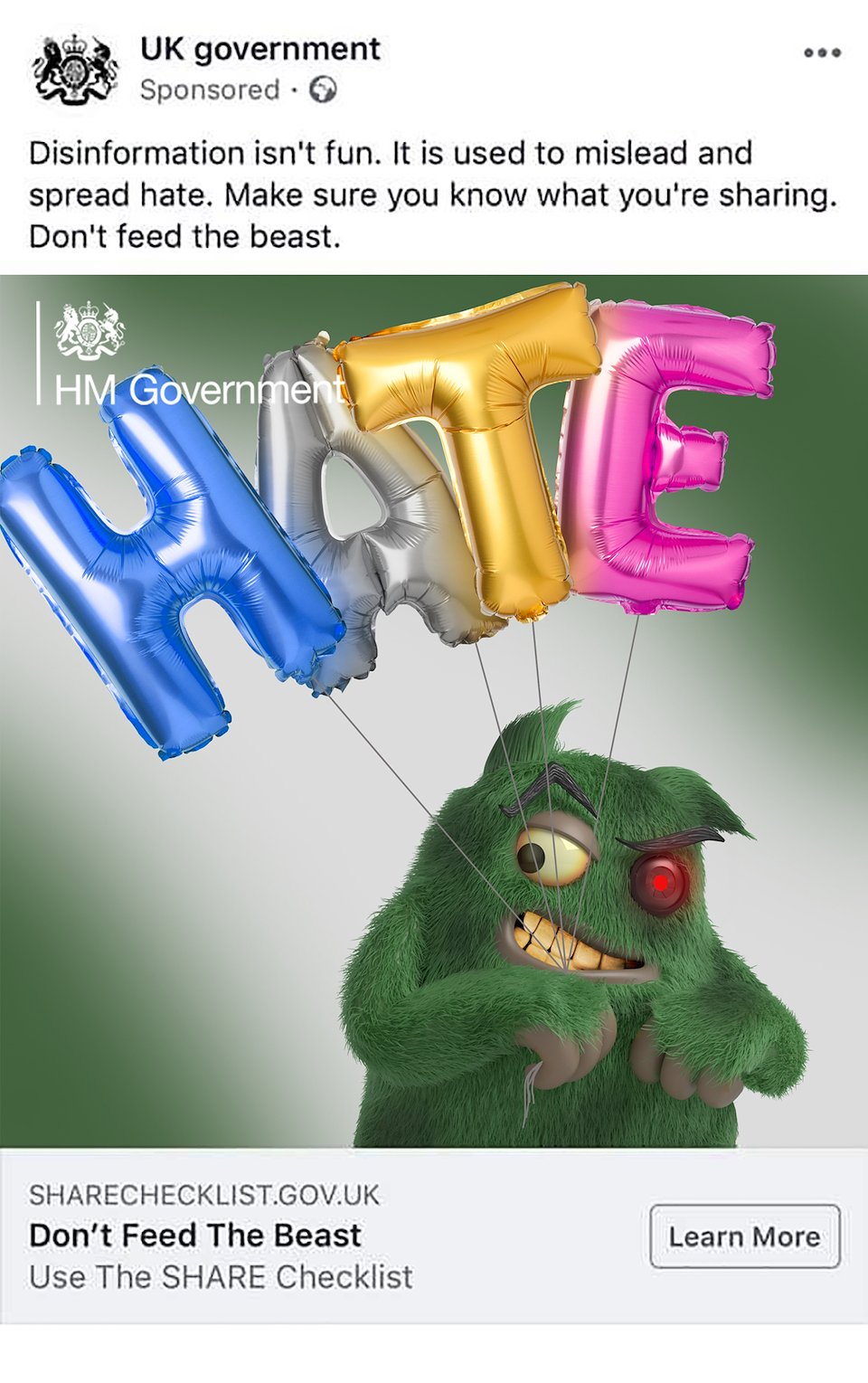 The campaign centres around a small, furry green monster we called The Beast. A dark, scheming, cold, snidey creature who revels in the misfortunes of others. The Beast is a manifestation of the negative consequences that sharing the wrong kind of content online can create: misunderstandings, hatred, miscarriages of justice, health scares and worse. It feeds on disinformation and misleading content.