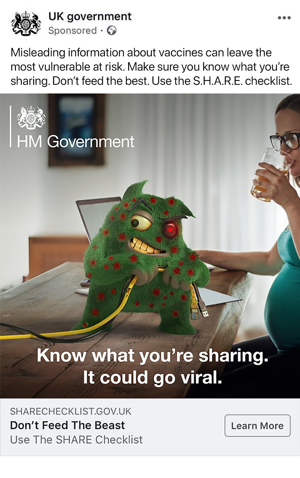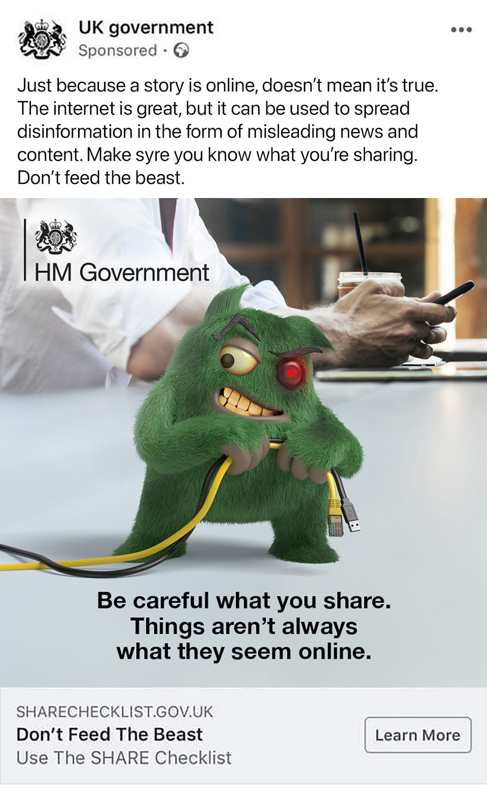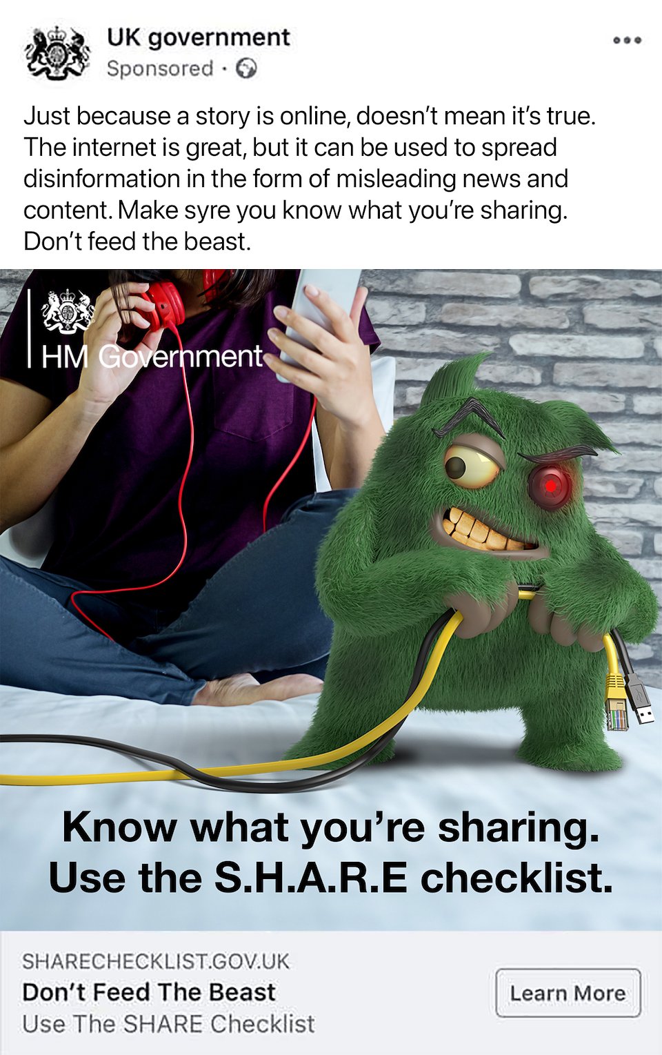 The campaign centres around a small, furry green monster we called The Beast. A dark, scheming, cold, snidey creature who revels in the misfortunes of others. The Beast is a manifestation of the negative consequences that sharing the wrong kind of content online can create: misunderstandings, hatred, miscarriages of justice, health scares and worse. It feeds on disinformation and misleading content.