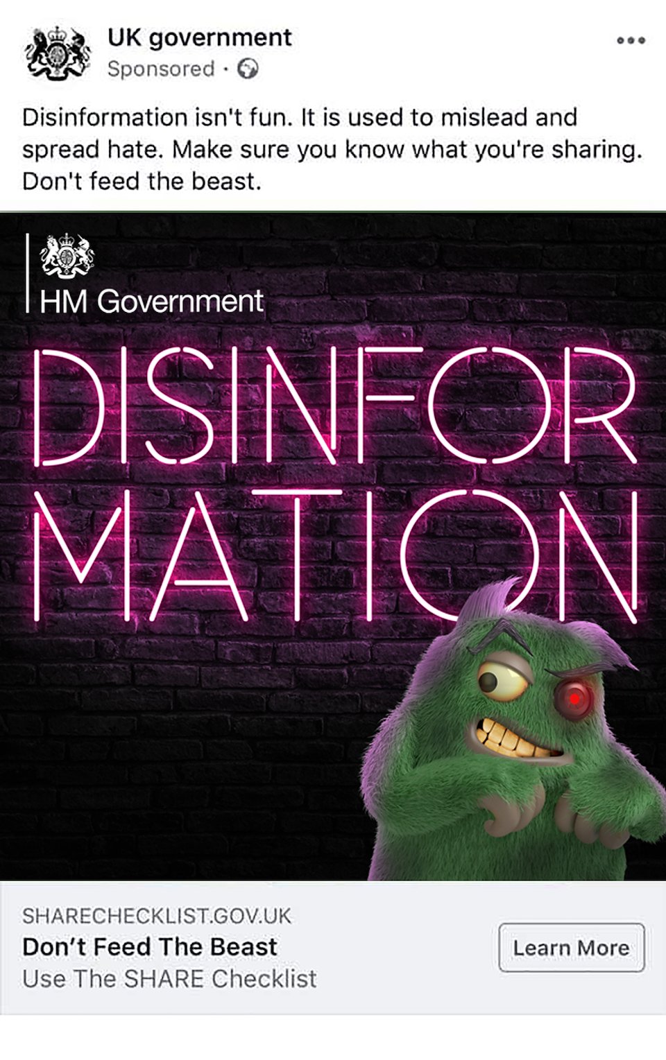 This campaign was created for the Cabinet Office to alert the public to the hidden danger that disinformation represents and more importantly, how to spot it.